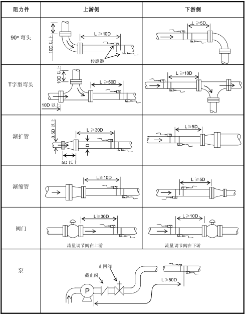 2、测量点要选择距上游10倍直径(10D)、下游5倍直径(5D)以内的均匀直管段,该范围内没有任何阀门、弯头、变径等干扰流场的装置。直管段长度推荐采用下表所示的数值。