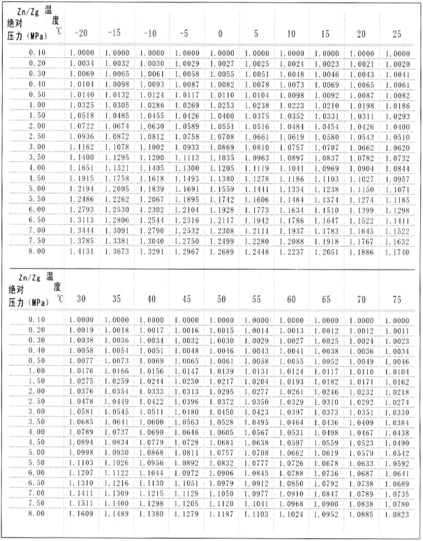 式中:Tg、Pg、Pa含义同上,Qg为体积流量,Qn为标准体积流量,Zn/Zg数值列于表2。因计算步长较大,表内数据仅供参考,表中数据按天然气真实相对密度Gr=0.600,氮气和二氧化碳摩尔分数均为0.00计算。当介质压力低于0.1MPa,均可按Zn/Zg=1.00估算。