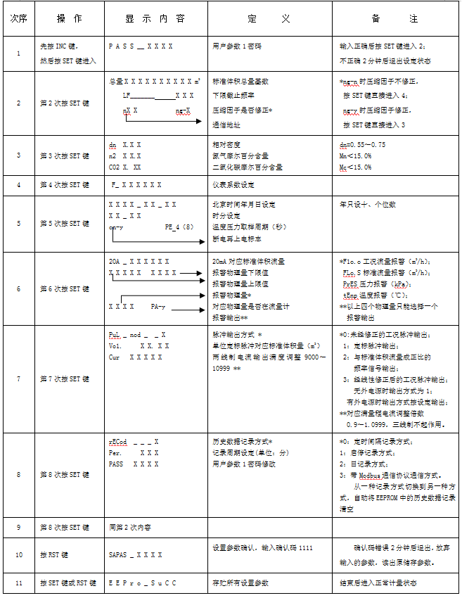 1、流量计各参数的代号、定义及操作次序见表4、表5,用户不得随意更改参数。